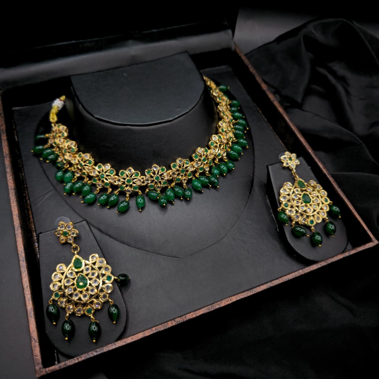 - Dangling Beads: Echoing the necklace’s design, the bottom of each earring is adorned with a fringe of the same emerald green, droplet-shaped beads, providing elegant movement and tying the set together cohesively.