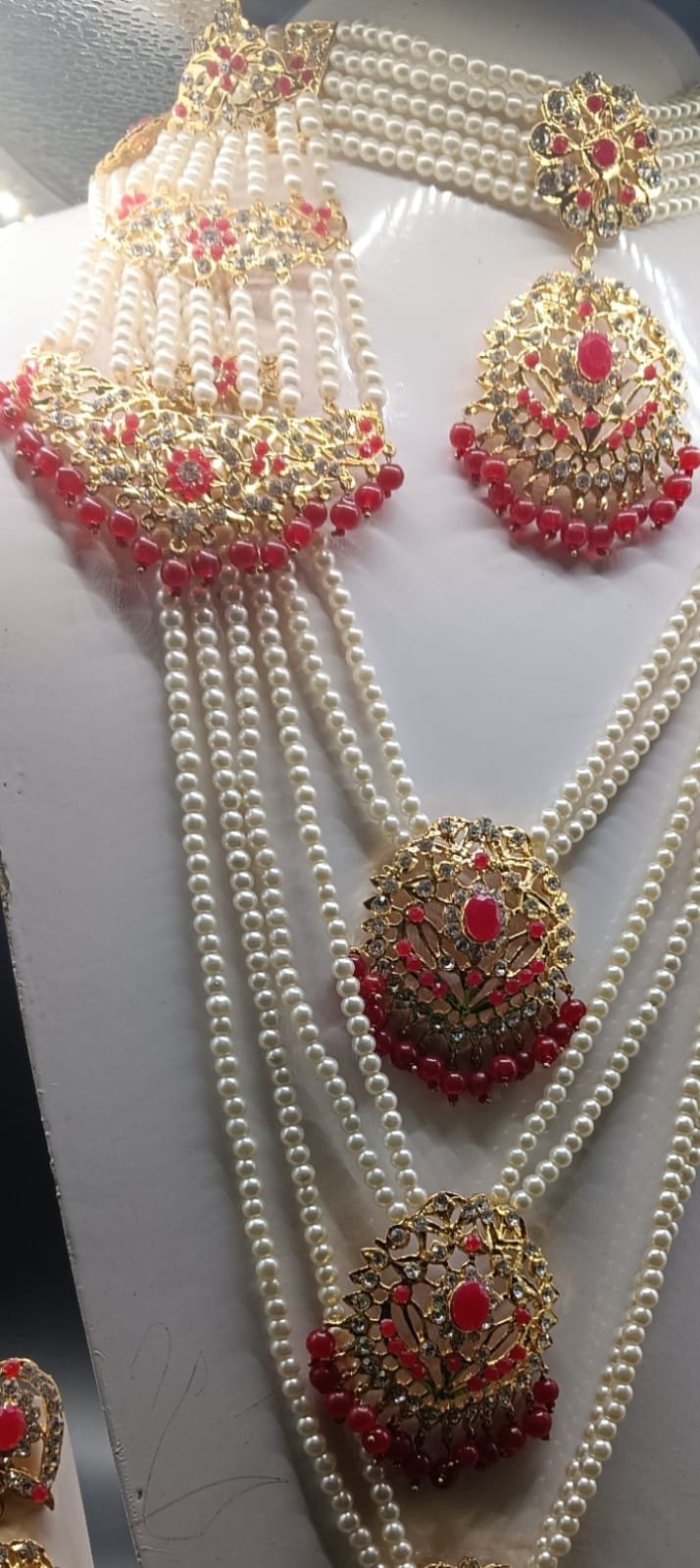 • Main Pendant: The pearl strands converge into a large, fan-shaped or triangular pendant at the bottom. This piece is elaborately decorated in the same style as the rest of the set, with intricate gold work, red and clear stones, and a fringe of red beads.