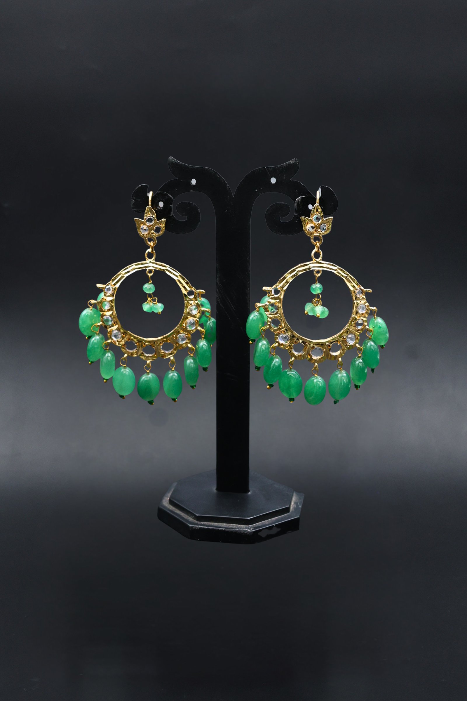 Grace your festive look with these statement Green Onyx Ornate Earrings — a stunning blend of heritage and style. Featuring classic crescent-shaped frames adorned with mirror-polished stones and deep green onyx beads, these earrings are perfect for weddings, mehendi, or festive soirées. The inner bead drops add a graceful swing with every step.